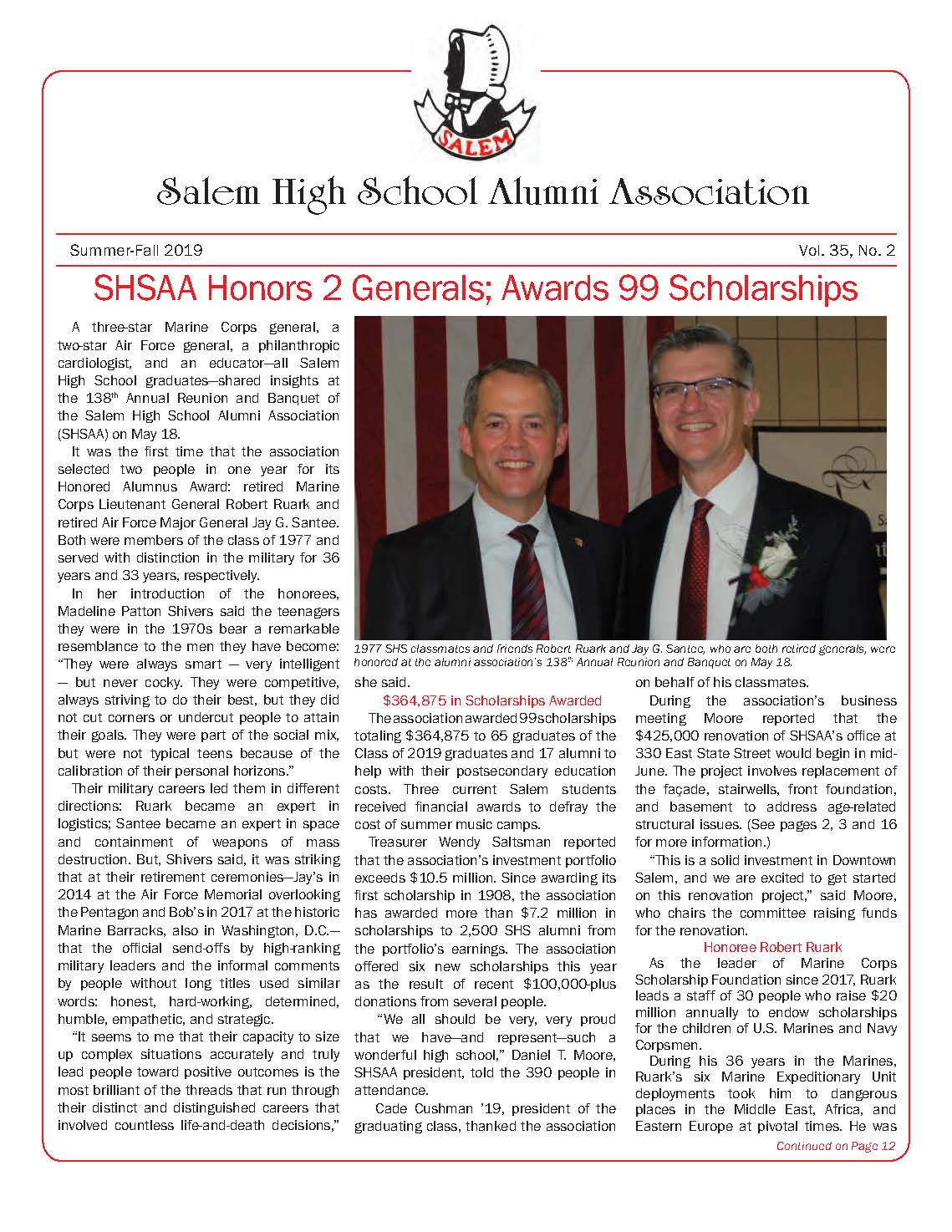 The Summer-Fall 2019 edition of the newsletter features two retired U.S. generals who both graduated from Salem High School in 1977 and went on to serve with distinction. Retired Marine Corps Lieutenant General Robert Ruark now leads the Marine Corps Scholarship Foundation. Air Force Major General Jay G. Santee is vice president of Strategic Space Operations at The Aerospace Corporation.